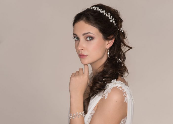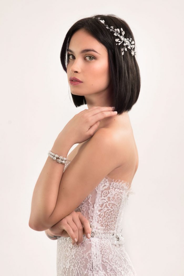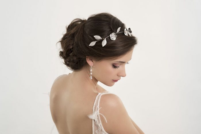 detalle del bordado del vestido de novia Lenna, tul de seda con cristales y hojas 3D